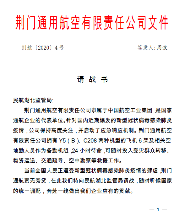 “當(dāng)前全國(guó)人民正遭受新型冠狀病毒感染的肺炎疫情的肆虐,荊門通航責(zé)無(wú)旁貸,特向民航湖北監(jiān)管局請(qǐng)戰(zhàn),隨時(shí)聽候國(guó)家的統(tǒng)一調(diào)配,奔赴一線,做出企業(yè)應(yīng)有的貢獻(xiàn)”,1月28日,荊門通航鄭重向民航湖北監(jiān)管局遞交請(qǐng)戰(zhàn)書,主動(dòng)請(qǐng)戰(zhàn),為抗擊新型冠狀病毒肺炎疫情保障工作隨時(shí)待命。